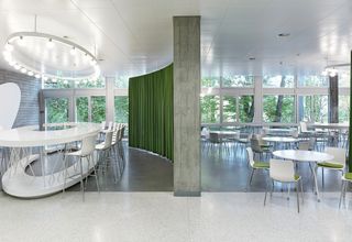 Wave カーテンは、外部スペースの緑を内部に取り入れます。また、両側で使用できるように調整されており、必要に応じてスペースを柔軟かつ完璧に 3 つの小さなユニットに分割できます。自動販売機、食品返却など、あまり魅力的ではないことが多いエリアは、トイレへのプライバシー ウォールを作成するホワイトキューブに統合されています。