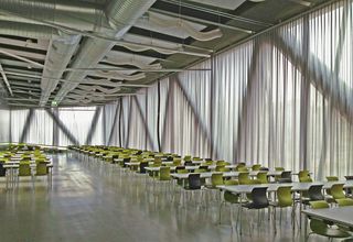 レクチャーホール キャンパスセンターのアルミニウムファサードは五角形をしており、銀色に輝いています。個々の講堂の上昇するラインは、建物の長辺に沿ってはっきりと見えます。傾斜した窓のファサードからは、内部にレイアウトされた講堂がはっきりと見えます。内部の遮光と防眩は、最大16mまで伸びるエレクトリックカーテントラック SG 5600 によって提供され、彫刻的で盛り上がった外観をさらに強調するように設計されています。 19度傾斜した講堂の天井は建築上の特徴ですが、エレクトリックカーテントラックがカーテンの重量による引張荷重を常に支えていることを意味します。
