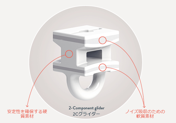 聴覚的なものと同じくらい視覚に配慮して開発されたSilent Trackは、妥協をしたくない建築家、インテリアデザイナーだけでなくエンドユーザーのためにもカーテントラックの仕様について新しい基準を設定します優れた2コンポーネント (2C) のグライダーとローラー (特許申請中) に、特別なコーティングを施したレールを組み合わせることで、カーテンがスムーズかつ静かに開閉することを可能にします。2Cグライダーの製造には2種類の素材が使用されており、硬質な素材で安定性を確保し、軟質な素材でノイズを吸収します。結果としてこれまでになかった静かさを実現します。